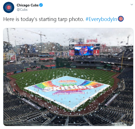 - Some quick research to get the back story on this series may have generated engagement ideas – try a “rain delay” giveaway – encourage Cubs and Nats fans to guess how long the delay would be – the person coming the closest gets some free Skittles swag.